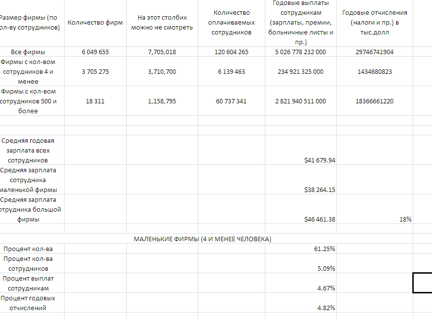 Чтобы посчитать долю малых предприятий (в США — до 500 чел.) в ВВП страны, надо все это приводить, вычитать и т.д.