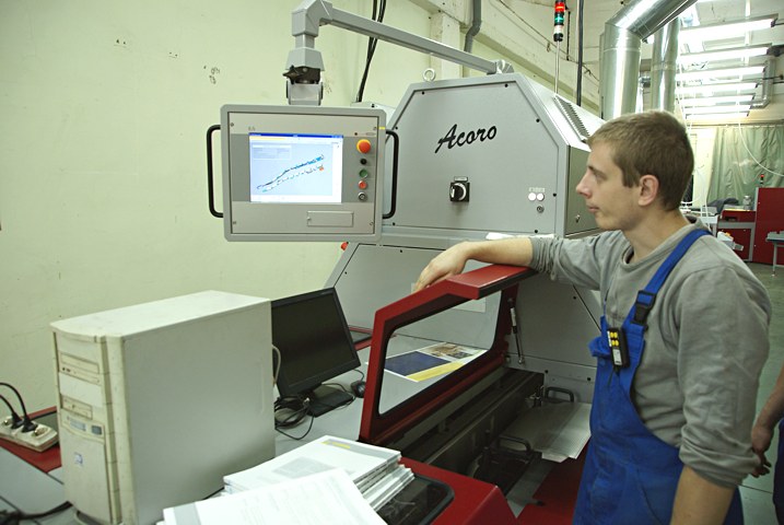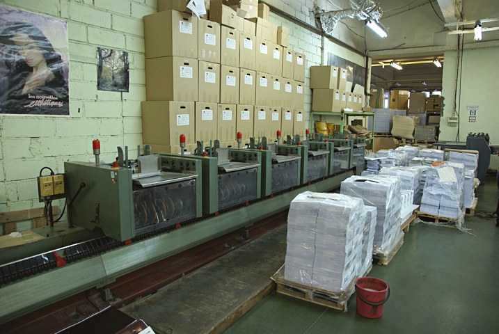 И на десерт - самое вкусное. Новенькая "Acoro A5" MULLER MARTINI. Подбирает тетрадки с 24 станций, клеит на горячий PUR или HQ клей, бигует обложку, подрезает брошюру с трёх сторон в линию. Длинная, красивая, блестящая (т.к. новая) машина.