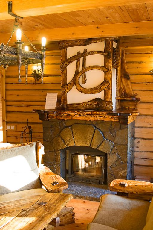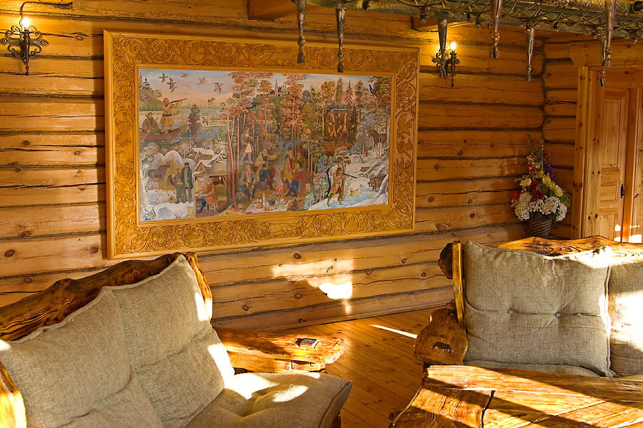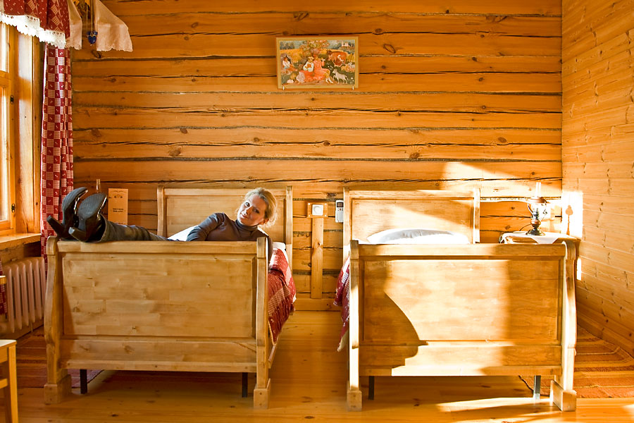 Домик представляет из себя настоящий сруб из толстенных бревен. Внутри — приличных размеров комната, большой коридор и ванная. В некоторых домиках — по два таких номера, каждый с отдельным входом и крыльцом, в других два номера объединены общей гостиной.