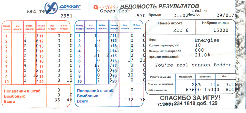 Вот и я зашел.. Похвастаться особо нечем.. в первый раз все таки.. ПА - Раз двести может и хотели, но не попали.. у нас счет по взаимопопаданиям почити равный Ваш номер 16 синий ? мой 6 красный.. поглядим 17на21 Так-что рука поднималась .. и неплохо поднималась.. Кстати инфо You`re real cannon folder как переводится? у всех инфо по русски, ток у мя по англицки.. что за напасть-то такая.. Номер 6 Очков 15000 Перезарадок 18 Выстрелов 800 (экономно, когда у кого-то за 3000 зашкаливало) Процент попаданий 21% Место 3 из 8