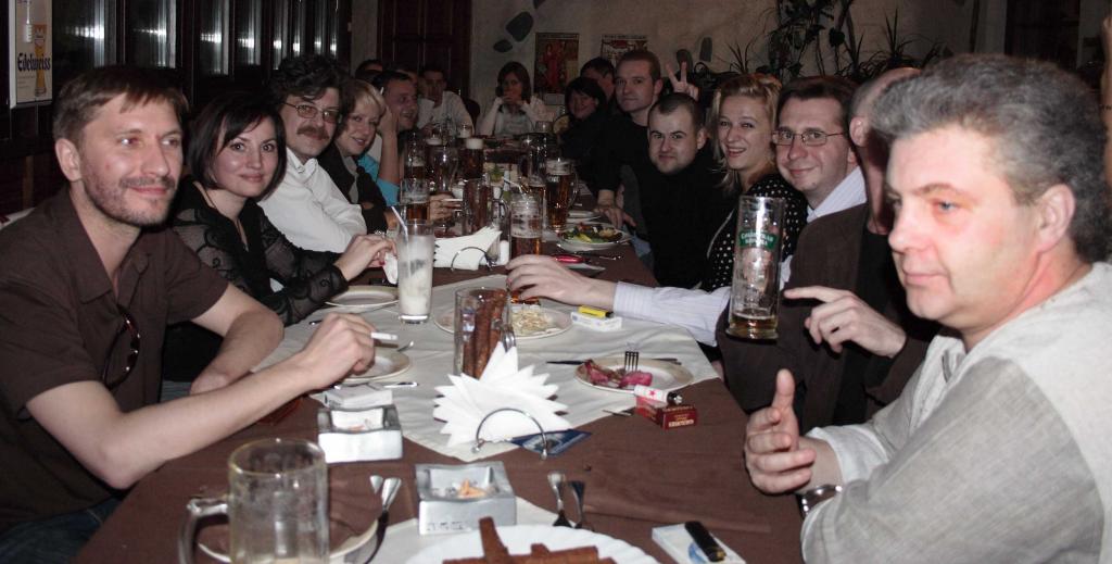 Это новенький какой-то затесался... К полиграфии отношения не имеет, это точно. Посидел со всеми, поел, выпил и скрылся... Чтобы никто ничего заранее не заподозрил, "небритенький мальчик" периодически приветствовал всех присутствующих кивками головы, радостными возгласами и рукопожатиями. "Нестриженый дедушка" даже проникся и вручил мальчику свою визитку, типа хвастался, что он, дедушка, большой человек и все такое...