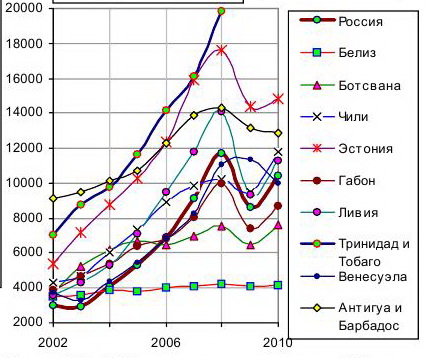 вот вам интересный график ВВП на душу населения обратите внимание - оказывается не мы одни осчастливлены Путиным. такие же замечательные президенты облагодетельствовали собой и другие страны (соответствующие нам по указанному показателю)