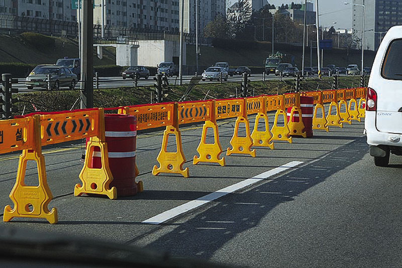 Ремонтируемая часть полотна огорожена светоотражающими красными столбиками с шагом в пять метров (ночью прикольно смотрится ) Плюс бетонные ограждения по всей длине, сцепленные в единую стену высотой в 1 м. (на рисунке похожие, только вместо желтого пластикового ограждения использовали бетонные)