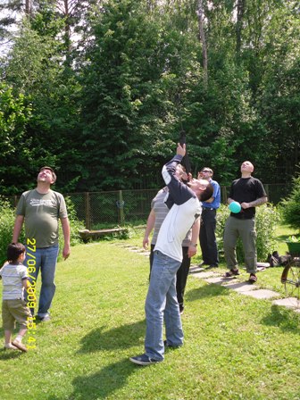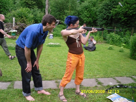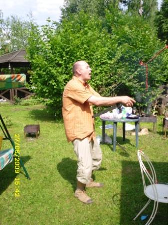 Вот! Посмотрите на первую фотку, где Маньяк стреляет. На заднем плане сижу я... на лужайке и, как от назойливой мухи, отмахиваюсь от Макса, который меня доставал в те редкие минуты, когда сын Степы не рубил меня мечом.