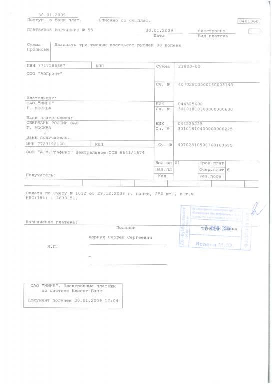 Прикольно, да? (см. скан платежки с отметкой банка) Я вот могу посмотреть свои платежки, а ты приходы в банке? Я платил за папки, блин, по счету не 60, блин, а по счету 1032!!!! Так закройте мне то что я платил! У вас же первых проблемы будут! Вы закрываете, то что не получали, ну как не понятно?