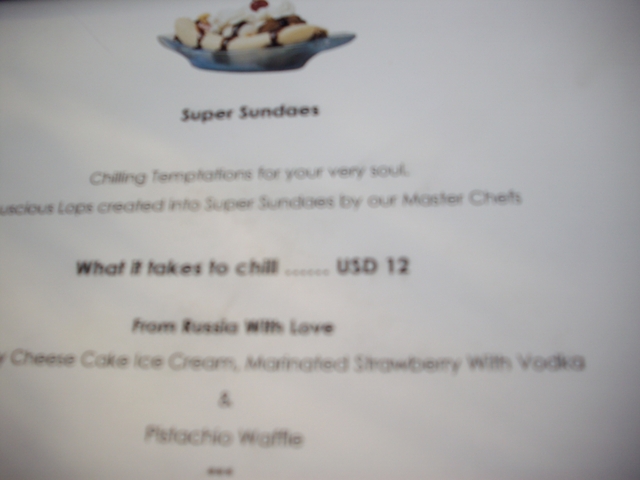 Я уже говорил, кажется, что население острова на 90% - наши... Нет, обслуга-то - бандерлоги, ... удивительо плохо говорящия на нормальном русском языке при таком количестве ключевой клиентуры... хотя, справедливости ради, надо сказать, что на языке потенциального противника дети океана мурлыают так же непонятно, с трудом понимая сами себя. Короче, след наш здеь неизгладим. Какая нация ещё добьётся того, что по утрам в outside баре предложат мороженое с... водкой... по $12! И назовут это "Из России с любовью"... Качество полиграфии здесь ИРМовское, так что не обессудьте за фото.