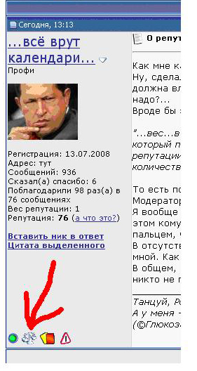 То есть получается, что в конечном итоге Репутация зависит не от обьектива участников, а от настроек, настроения и левой ноги с. Модератора? Хочется спросить - а судьи кто?(с)... но все знают, кто. И сразу становится скучно. Я вообще ни хр*на в ваших игрушках не понимаю. Искомые кнопки изменения чужой репутации на моей панели отсутствуют вообще, в этом кому-то ( по привычке не будем говорить кому, хотя подавляющее большинство знает, кто это... всё-таки хочется показать пальцем, чтобы остальные, кто пока не в теме, тоже знали, о ком речь) сильно повезло. В отсутствие индикации нужных кнопок я изумлённо смотрю, как мне в ЛК приходят повышения репутации за посты, написанные не мной. Как это влияет на "вес" репутации - известно лишь ишаку аллаха, сам аллах об этом и не знал, не его паства придумала это. В общем, как с кнопкой на ядерном чемоданчике Президента. Все знают, что она есть, но есть ли у Чемоданчика связь хоть с кем-то - никто не проверял потому, что все боятся нажать кнопку.