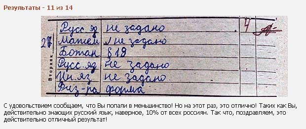 С удовольствием сообщаем, что Вы попали в меньшинство! Но на этот раз, это отлично! Таких как Вы, действительно знающих русский язык, наверное, 10% от всех россиян. Так что, поздравляем, это действительно отличный результат!
